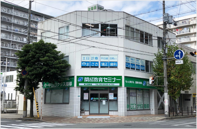 医院外観 1階に学習塾(開成教育セミナー)があるビルの2階が診療所です。 |